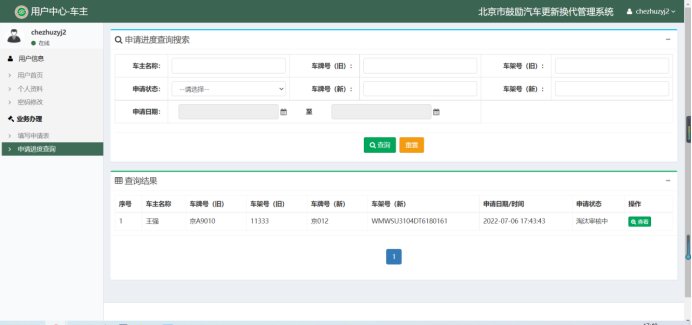 4.车主提交申请后,可在【申请进度查询】中查到申请状态。