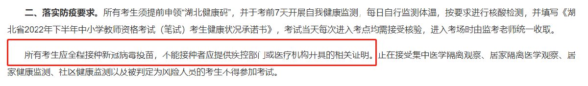 所有考生应全程接种新冠病毒疫苗,不能接种者应提供疾控部门或医疗机构开具的相关证明。正在接受集中医学隔离观察、居家隔离医学观察、居家健康监测、社区健康监测以及被判定为风险人员的考生不得参加考试。