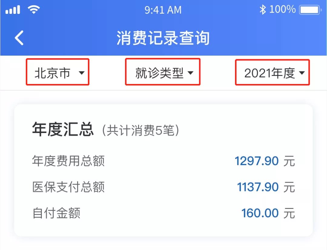 2.还可以点击页面头部的筛选项,通过选择参保地、就诊类型和年度来筛选出你想要查询的消费记录明细。