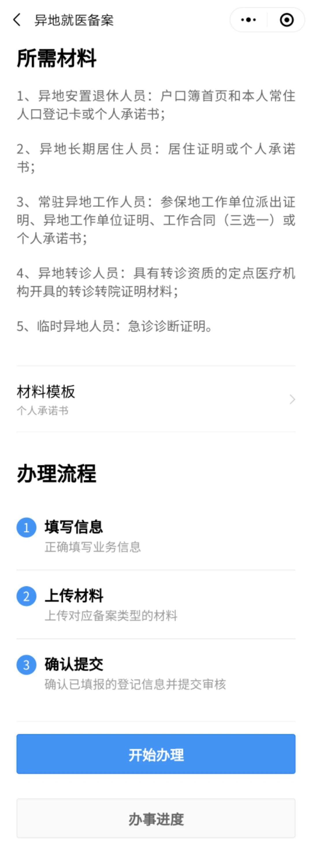第三步:点击进入“异地就医备案”界面后,请大家认真阅读“办理须知”,下拉页面到底部,点击“开始办理”进入备案界面。