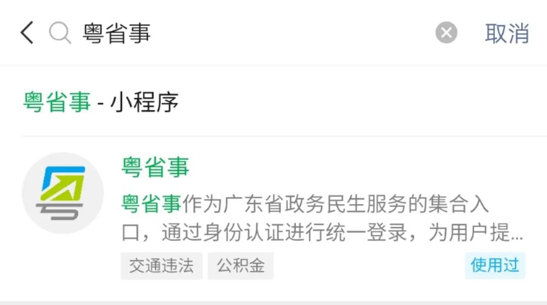 第一步:打开“微信”首页,在搜索栏里输入“粤省事”,搜索后点击小程序。