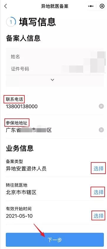 第四步:按照顺序自行填入需备案人【联系电话】、【参保地地址】以及选择【备案类例】和【有效开始时间】。