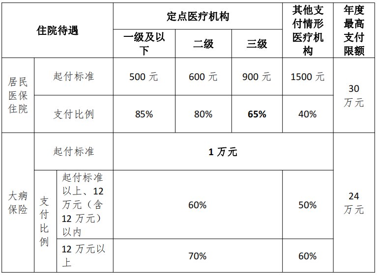 起付标准:起付标准分别为一级及以下定点医疗机构500元,二级定点医疗机构600元,三级定点医疗机构900元,其他支付情形医疗机构1500元。在二、三级定点医疗机构住院的参保人向家庭病床定点医疗机构转诊并建立家庭病床的,不设起付标准。