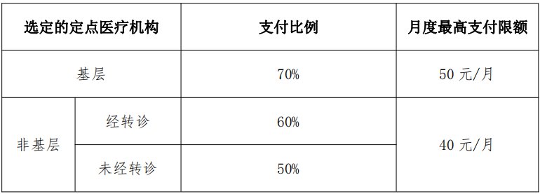 最高支付限额按基层选定医疗机构和其他选定医疗机构两个限额分别享受待遇,基层选定医疗机构和其他选定医疗机构每人每月最高支付限额为50元和40元,当月累计未达到最高支付限额,可结转到下月使用;