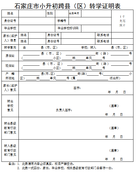 因家庭住址迁移等原因,需跨县(区)升入公办初中的小学毕业生,由转入县(市、区)教育局查验小学生综合评价手册、户口簿、符合条件的《房屋所有权证》或《不动产权证书》以及《石家庄市小升初跨县(区)转学证明表》后办理。其中,我区小学毕业生跨入石家庄市新华区、桥西区、长安区、裕华区、高新区就读公办初中的,根据石家庄市教育局统一安排时间通过“石家庄市义务教育招生入学服务系统”(登 录 市 教 育 局 网 站http://sjzjyj.sjz.gov.cn/链接进入)报名办理,并于7月24-26日到教育局普教股办理转学手续;我区小学毕业生到以上五区以外县(市、区)升学的,应持相关证件及《石家庄市小升初跨县域转学证明表》于7月24-26日到相关学校和教育局办理有关手续;非栾城区小学毕业生到我区升学的,须具备下列条件之一:在栾城区购置房产且入住;持有栾城区居住证(市内8区提供居住凭证即可)且法定监护人在我区有长期合法稳定工作(劳动合同及劳动保险一年以上或2022年6月15日前办理的居住证、营业执照且正常营业)。符合以上条件的可持以上相关票证及《石家庄市小升初跨县域转学证明表》于7月24-26日到栾城区教育局普教股登记审核,普教股依据居住地分配到指定学校。适龄儿童、少年再到指定学校办理报名等有关手续。未经教育局审核通过的,学校不得接受安排,否则不予注册学籍。