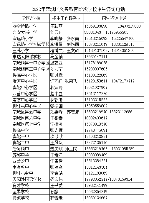 栾城镇第一中心学区、栾城镇第二中心学区、楼底中心学区、冶河中心学区由中心学区统一组织本学区小学招生工作,各小学不单独组织招生;其他学区由中心学区指导协调招生工作。各学区、学校设置招生办公室,指定专人负责,公布招生电话并上报普教股。
