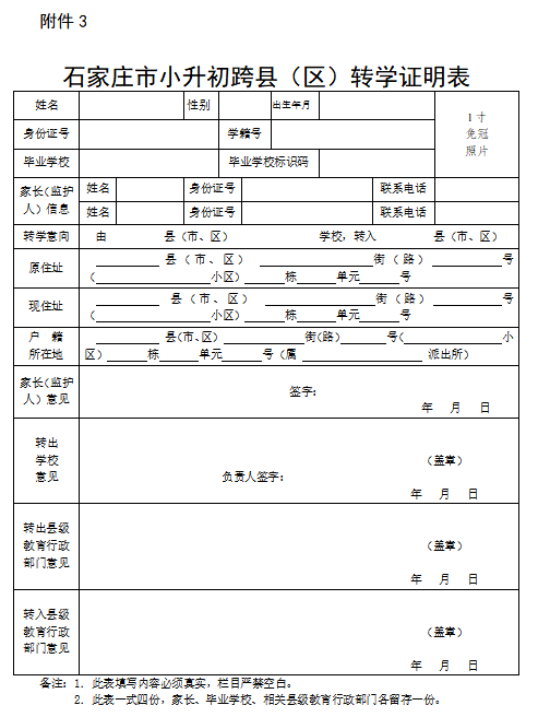 3.因家庭住址迁移等原因,需跨县(区)升入公办初中的小学毕业生,由转入县(市、区)教育局查验小学生综合评价手册、户口簿、符合条件的《房屋所有权证》或《不动产权证书》以及《石家庄市小升初跨县(区)转学证明表》(见附件3)后办理。其中,我区小学毕业生跨入石家庄市新华区、桥西区、长安区、裕华区、高新区就读公办初中的,根据石家庄市教育局统一安排时间通过“石家庄市义务教育招生入学服务系统”(登 录 市 教 育 局 网 站http://sjzjyj.sjz.gov.cn/链接进入)报名办理,并于7月24-26日到教育局普教股办理转学手续;我区小学毕业生到以上五区以外县(市、区)升学的,应持相关证件及《石家庄市小升初跨县域转学证明表》(附件3)于7月24-26日到相关学校和教育局办理有关手续;非栾城区小学毕业生到我区升学的,须具备下列条件之一:在栾城区购置房产且入住;持有栾城区居住证(市内8区提供居住凭证即可)且法定监护人在我区有长期合法稳定工作(劳动合同及劳动保险一年以上或2022年6月15日前办理的居住证、营业执照且正常营业)。符合以上条件的可持以上相关票证及《石家庄市小升初跨县域转学证明表》(附件3)于7月24-26日到栾城区教育局普教股登记审核,普教股依据居住地分配到指定学校。适龄儿童、少年再到指定学校办理报名等有关手续。未经教育局审核通过的,学校不得接受安排,否则不予注册学籍。