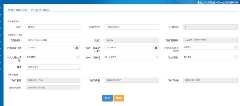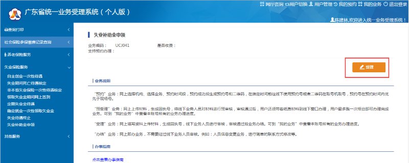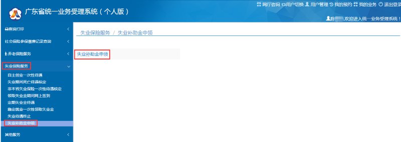3.登录成功后,通过路径:失业保险服务 ->失业补助金申领,点击【失业补助金申领】,进入失业补助金申领页面,选择【受理】按钮,校验通过后可填写相关信息并点击【提交】按钮完成网上申报。