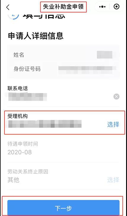 第五步:进入【填写信息】页面,系统会自动获取参保人员有关信息,核对后,手动选择【受理机构】,点击【下一步】。