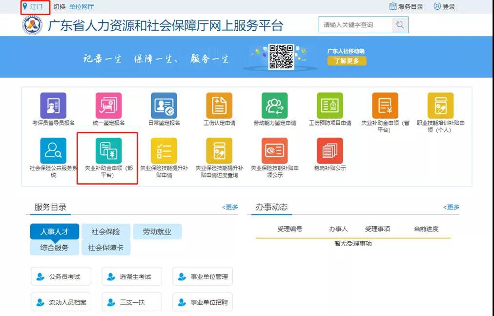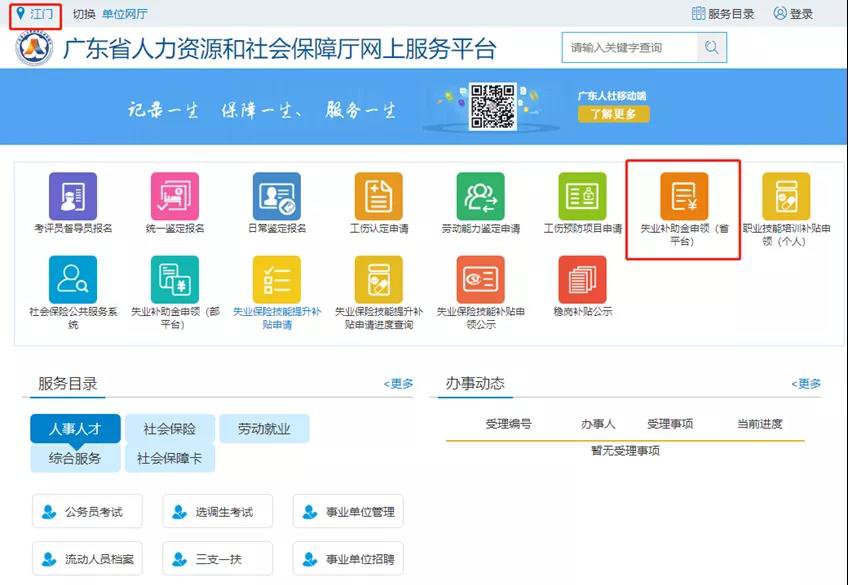 第一步:登录网址【https://ggfw.gdhrss.gov.cn/gdggfw/index.shtml】,选择【江门】,点击【失业补助金申领(部平台)】。