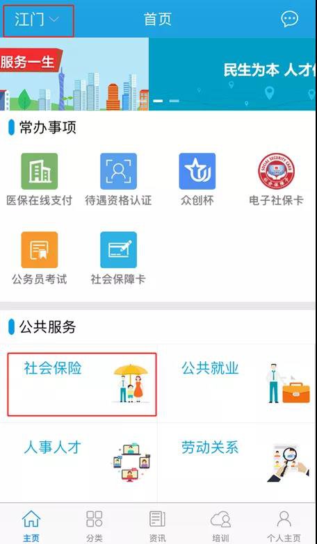 第二步:打开【广东人社】APP,完成注册并登录。进入【首页】,选择城市【江门】,点击【公共服务】的【社会保险】。