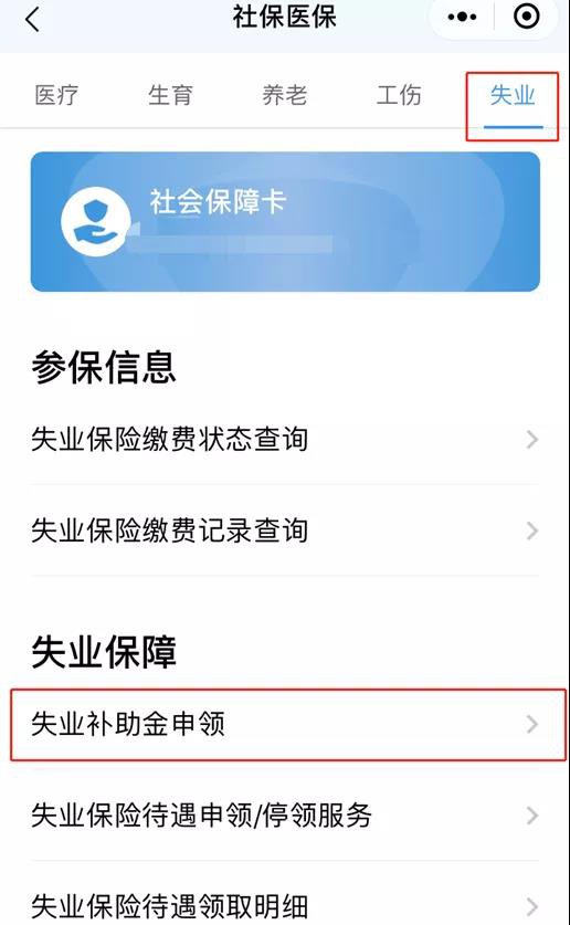 第二步:进入【社保医保】服务板块,选择【失业】,点击【失业补助金申领】,进入【失业补助金申领】页面。