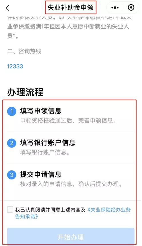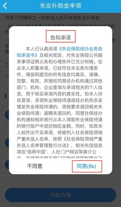 第三步:进入【失业补助金申领】页面,下滑勾选【我已认真阅读并同意上述内容及《失业保险经办业务告知承诺书》】,并点击【开始办理】。
