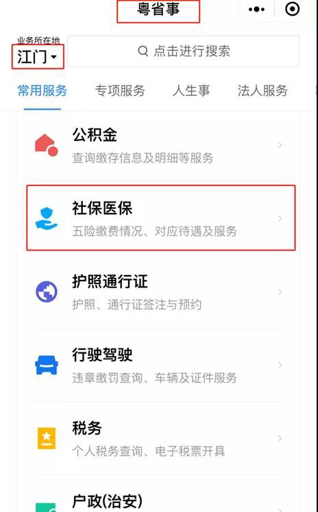 第一步:微信打开【粤省事】小程序,进入小程序后登录,选择城市为江门,下滑选择【社保医保】服务板块。