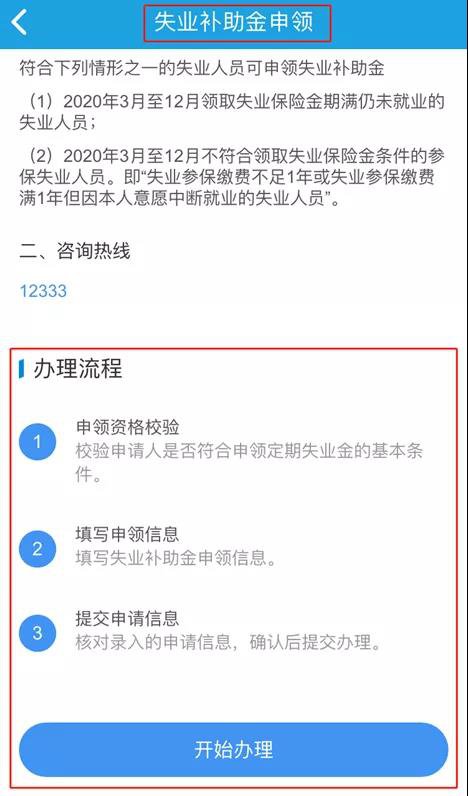 第四步:【进入失业补助金申领】页面,点击【开始办理】。