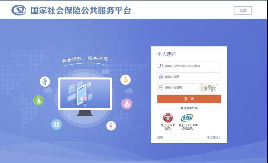 第二步:进入【国家社会保险公共服务平台】页面,填写相关信息并点击【登录】。如未注册的,按要求进行注册后再登录。