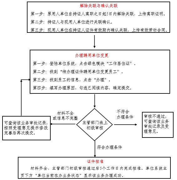 3.若续签与聘用单位变更业务同时发生时,请先由原单位办理续签手续,续签完成后再解除关联,避免证件失效;