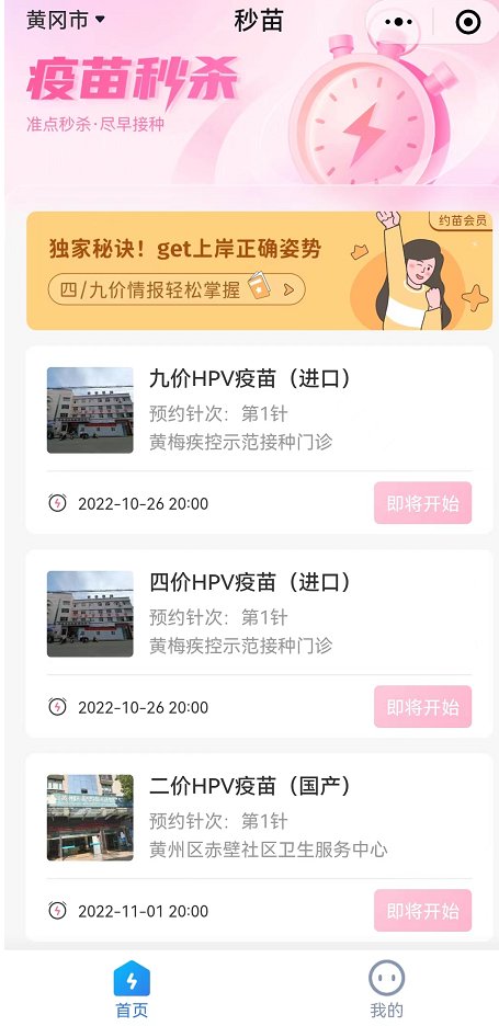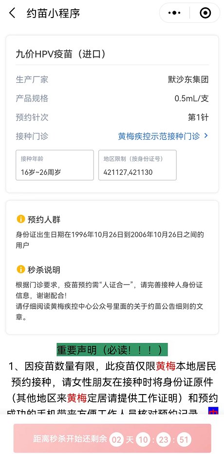 为保证公平预约接种及广大居民朋友尽快今早接种疫苗,黄梅县疾控中心后续将采用“秒杀抢苗”方式进行四九价HPV疫苗预约。可通过“秒杀抢苗”进入,或直接搜索小程序“秒苗”进入,请提前完善本人信息,定时抢苗。
