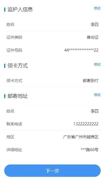 7. 确认领卡方式:“网点领卡”,申请人自主选择就近网点领卡;“邮寄到付”,通过邮政EMS邮寄到指定地点(邮费参考标准:省内18元,省外25元,省外偏远地区及港、澳、台地区除外)。核实信息准确无误后提交。