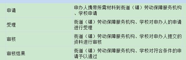 第一步:申请:申办人携带所需材料到街道(镇)劳动保障服务机构、学校申请