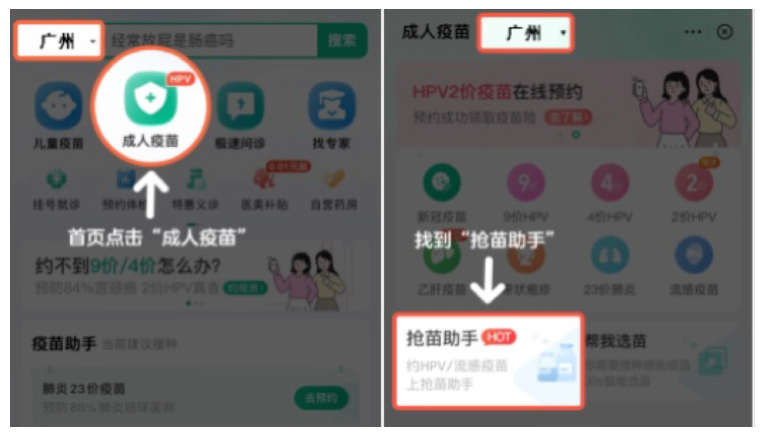 2、选择“广州”地区,点击医鹿APP首页 “成人疫苗” ,进入页面后再点击“抢苗助手”。