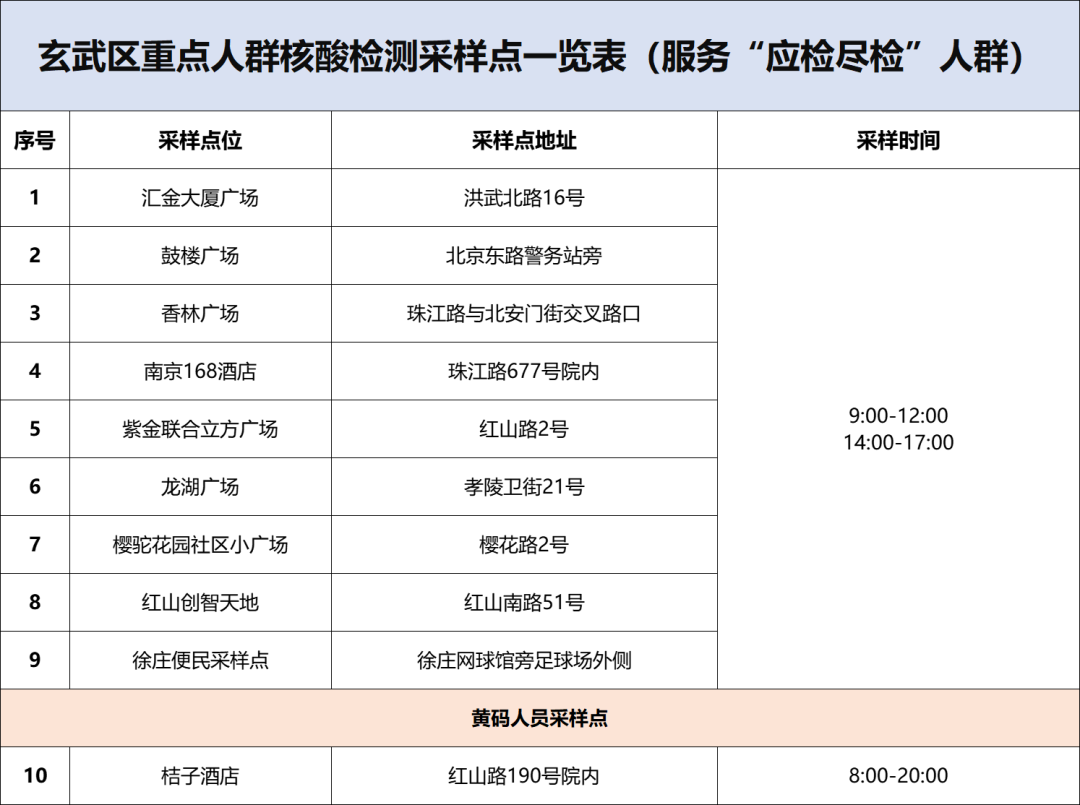 南京玄武区重点人群应检尽检核酸检测采样点一览