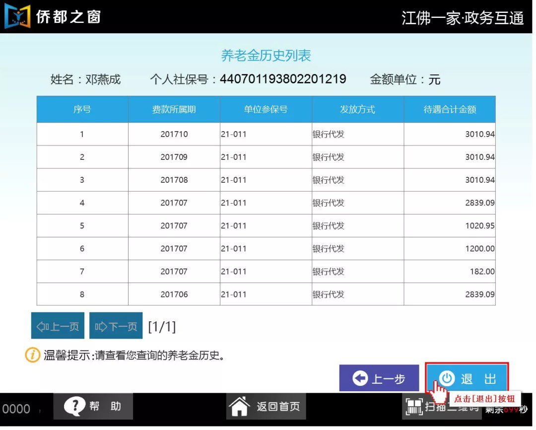 7.在【养老金历史列表】页面,查看养老金历史信息,可点击【退出】按钮返回首页