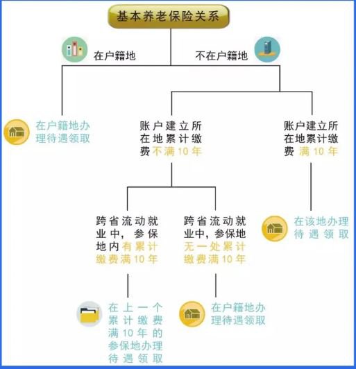 首先确定达到待遇领取条件时,基本养老保险关系参保地(即最后参保地)是否为户籍地,若在户籍地,户籍地即待遇领取地。若不在户籍地,看最后参保地是否缴费满10年,若缴费满10年,最后参保地为待遇领取地。若最后参保地缴费不满10年,则上一个缴费满10年地为待遇领取地。