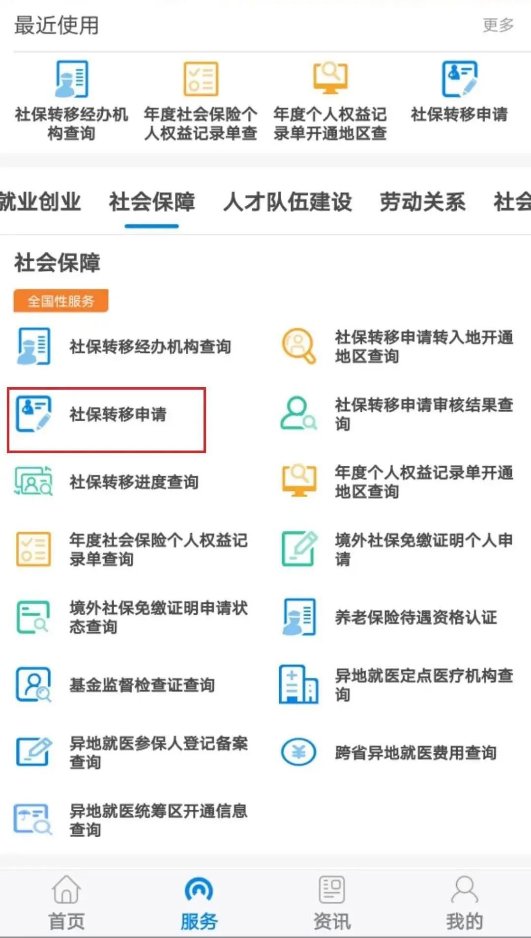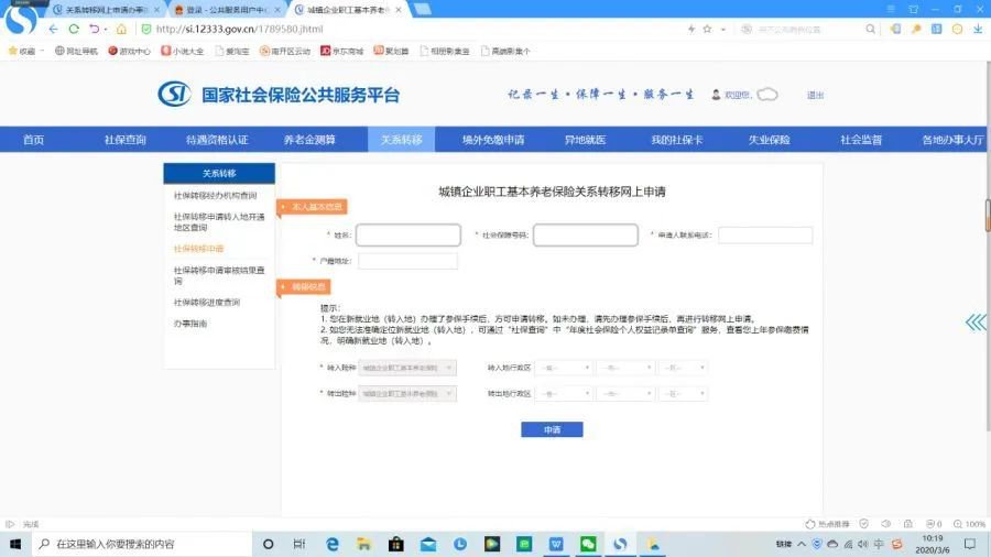 2.选择“社保转移申请”,填写个人信息,提交申请。