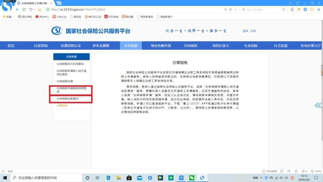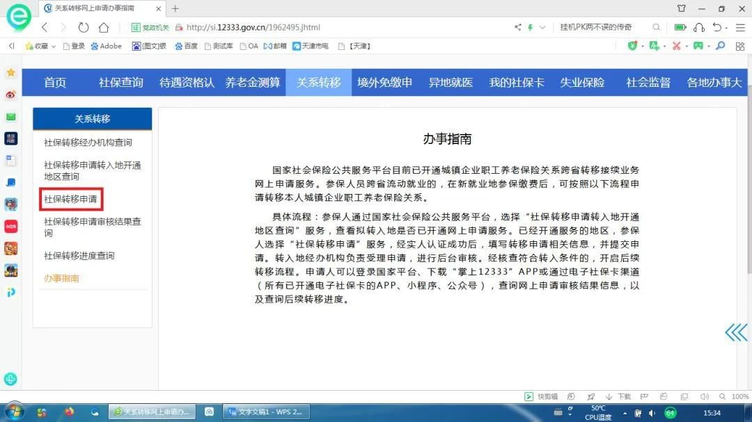 3.阅读办事指南,选择“社保转移申请”;