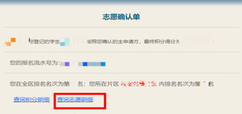 【提交志愿】后,系统跳转志愿确认单。此时志愿已经不能修改了。在志愿确认单,点击【查询志愿明细】按钮,可以查看填报志愿的详情。