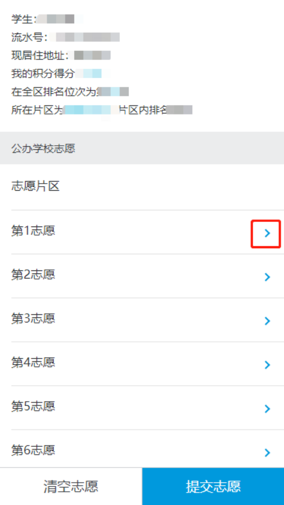 第3步:在志愿填报界面,按照您的志愿顺序,填入公办学校志愿。点击每个志愿右边的箭头“>”,切换学校列表,选择学校为志愿学校。(注意:学校不可重复,志愿必须填满)