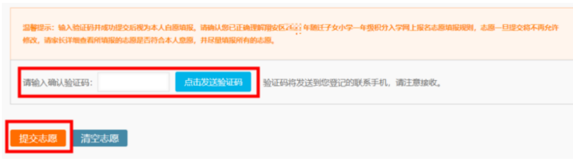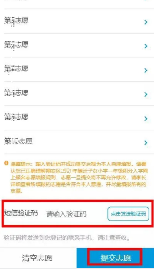 第4步:志愿都填好后,记得检查一遍是否有填错,因为一旦提交,就不能修改志愿了。点击【点击发送验证码】按钮,获取短信验证码后填入。点击【提交志愿】按钮,完成志愿填报。