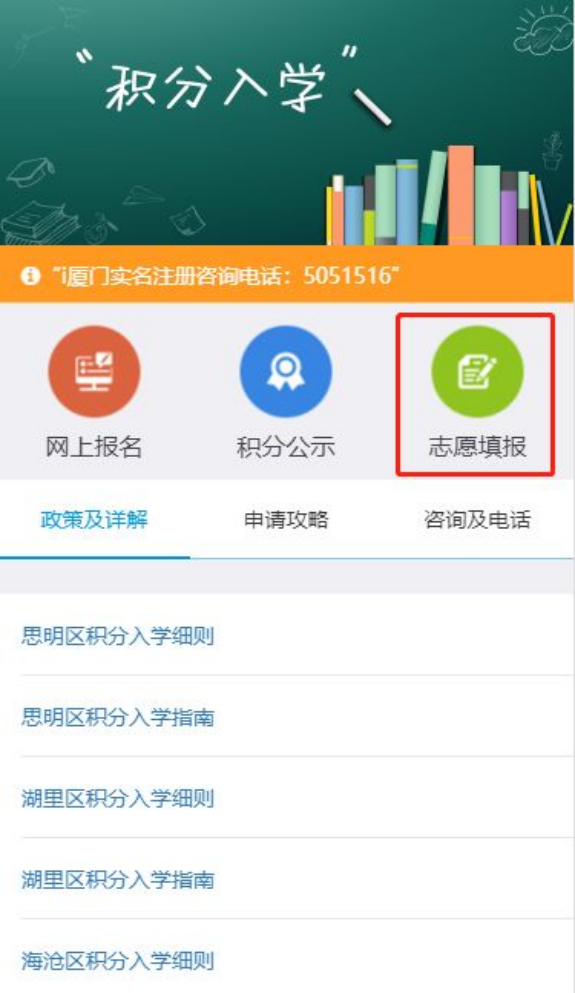 第1步:在“i厦门”微信公众号,后台进入“积分入学”模块。点击【志愿填报】图标。