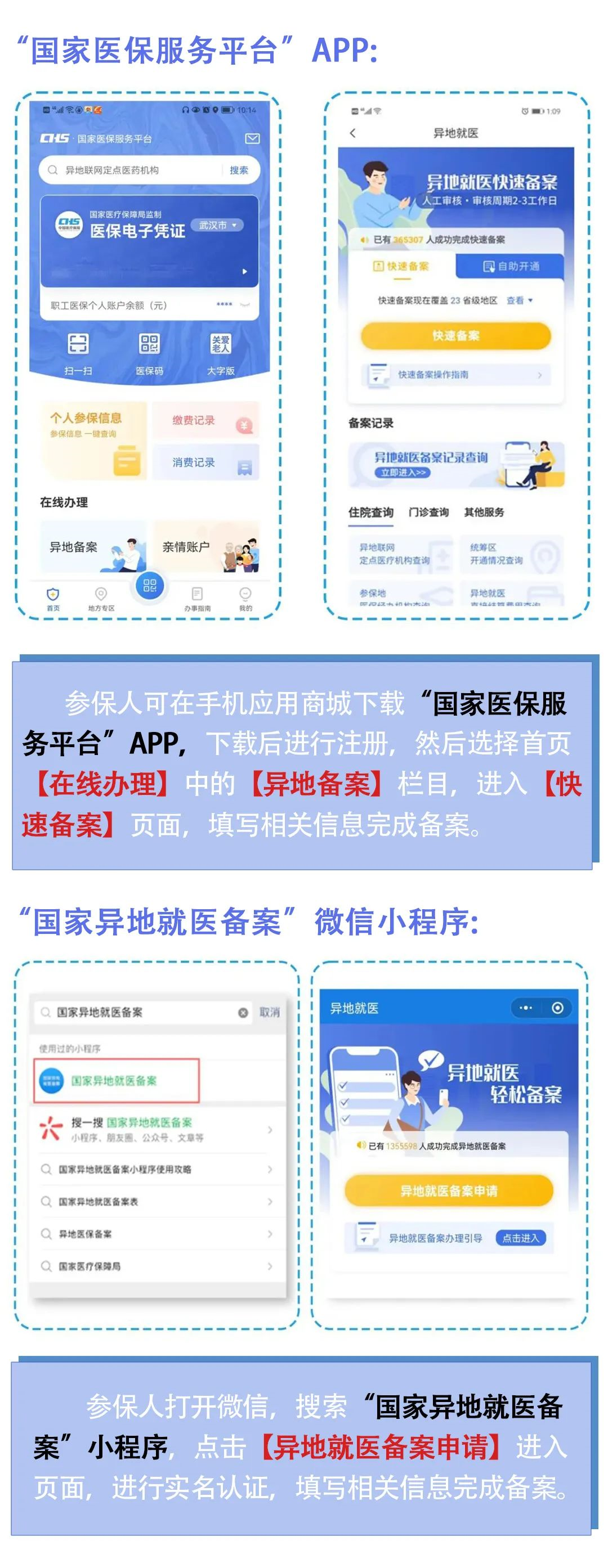 参保人可以使用手机登录“国家医保服务平台”APP或“国家异地就医备案”微信小程序申请办理。