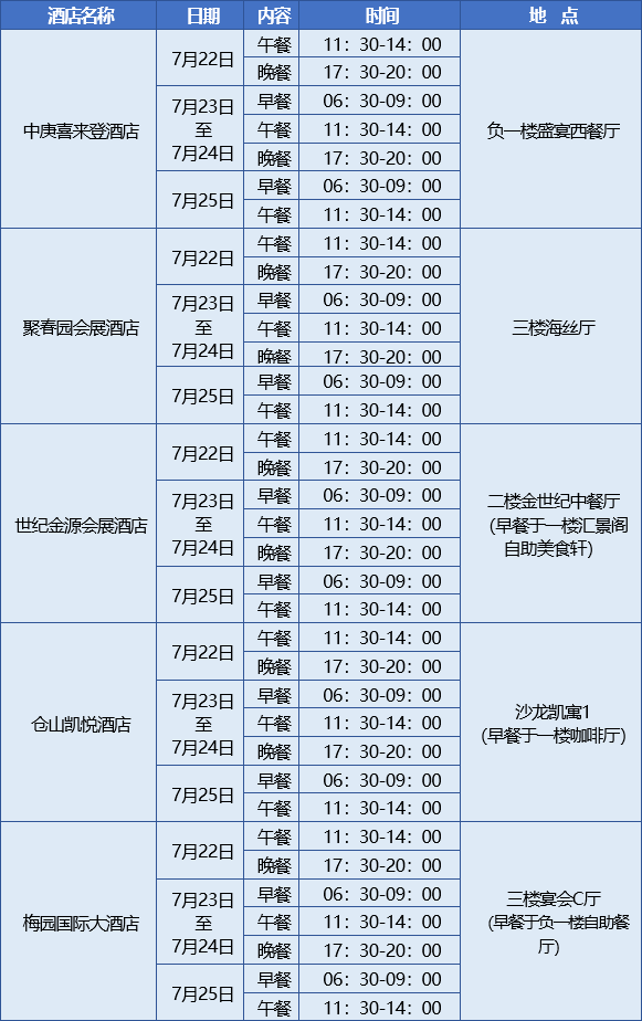 峰会将在各下榻酒店为参会嘉宾提供工作餐,形式为自助。请凭峰会证件/餐券入场就餐。具体信息详见以下用餐安排表: