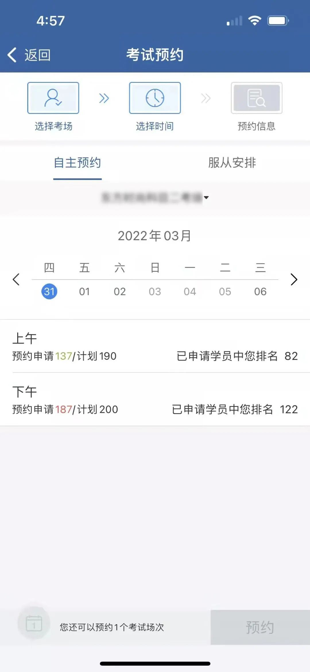 其中考试场次的选择方式有两种:自主选择和服从系统安排。选择自主选择考试场次的,系统显示考试场次列表,申请人可以选择某一场次或者多个场次进行预约。选择服从系统安排考试模式的,系统会在申请人选中的预约申请起止时段内的自动匹配符合条件的考试场次。