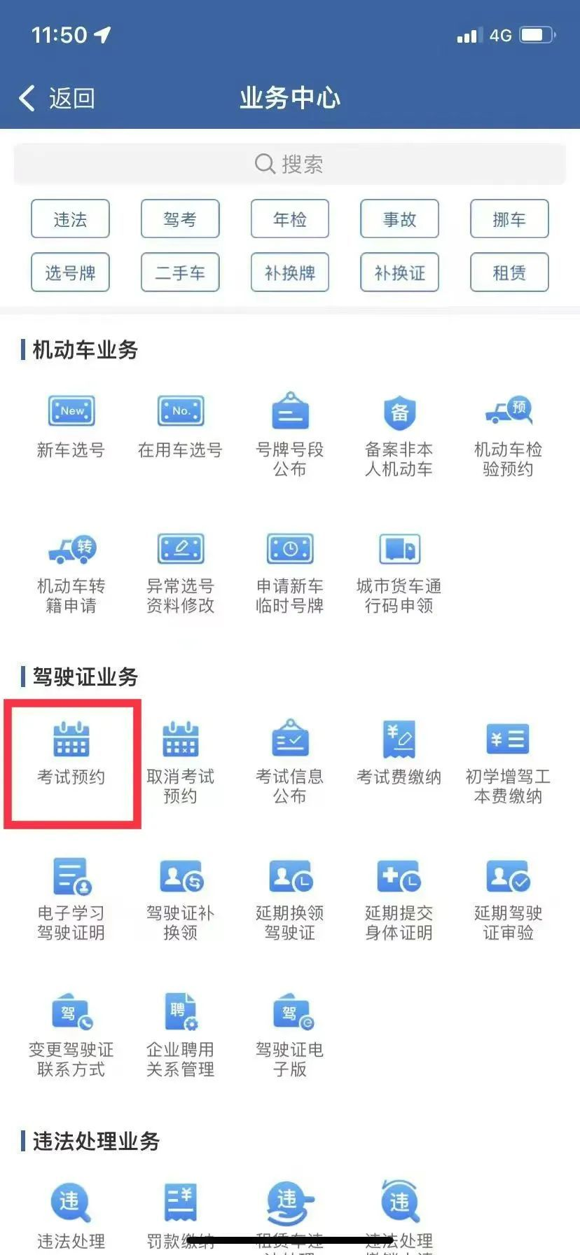 申请人预约考试时,首先登录“交管12123”APP,点击“考试预约”模块进入考试预约业务流程。点击选择考试科目,可选项有“科目一、科目二,科目三实际道路驾驶技能”科目,进入后选择考试地点、考试场次。同时已经学习科目二、科目三实际道路驾驶技能的,可连续申请考试科目二和科目三实际道路驾驶技能考试,在平台选择“科目二科目三实际道路驾驶技能”即可。