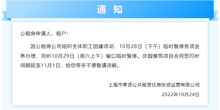 因公租房公司组织全体职工团建活动,10月28日(下午)临时暂停各项业务办理,同时10月29日(周六上午)窗口临时暂停。庆园雅筑项目合同签约时间顺延至11月1日,给您带来不便敬请谅解。