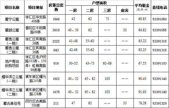 2、根据相关供应方案,目前馨宁公寓、馨越公寓、地产南站收购公租房可由单位或家庭(个人)承租。馨逸公寓(一期)、馨逸公寓(二期)、馨古美佳苑、耀华滨江公寓(一期)、耀华滨江公寓(二期)仅限单位集体租赁,对参与和服务本市科创中心、自贸试验区建设的全市各级机关、中央在沪企事业单位、市属重点企事业单位等予以重点支持。