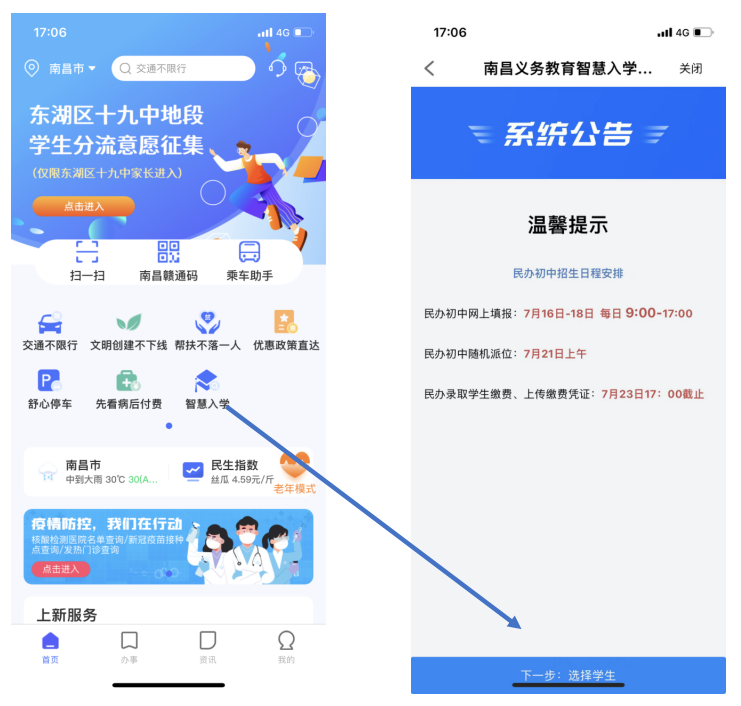 2、查看系统公告,点击底部【下一步:选择学生】。