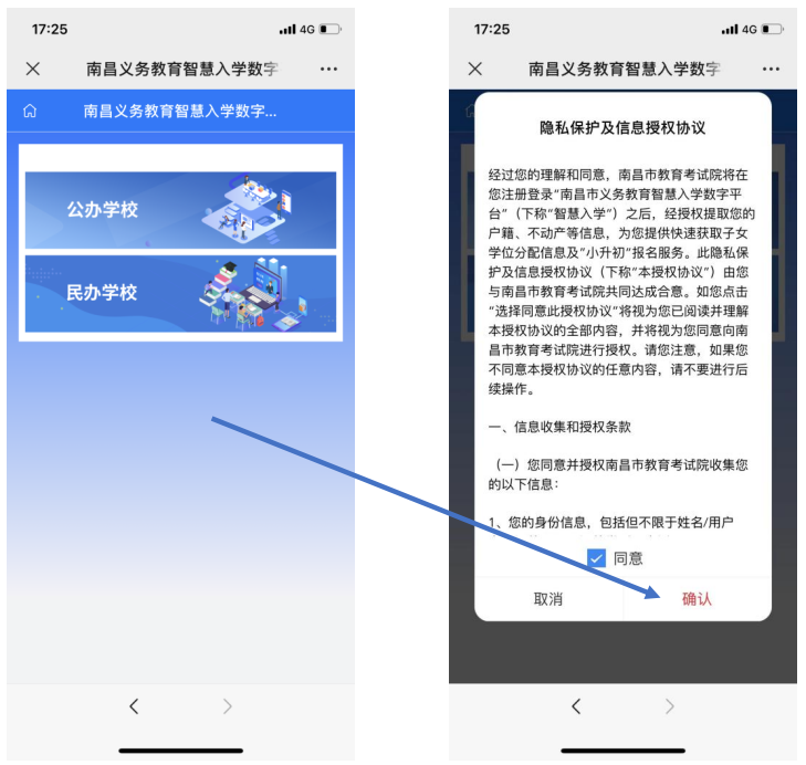 3、选择下方【民办学校】,勾选同意->【确认】隐私授权。
