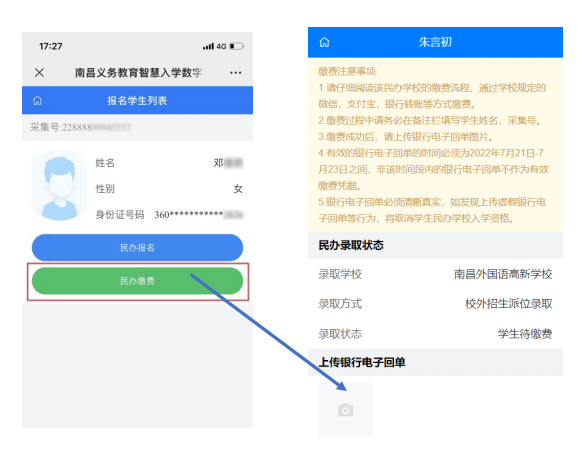 4、核对学生信息后点击下方【民办缴费】,进入缴费上传回单页面,请务必下滑页面查看学校缴费说明后进行缴费,缴费后上传缴费凭证(缴费凭证仅可上传一张)。
