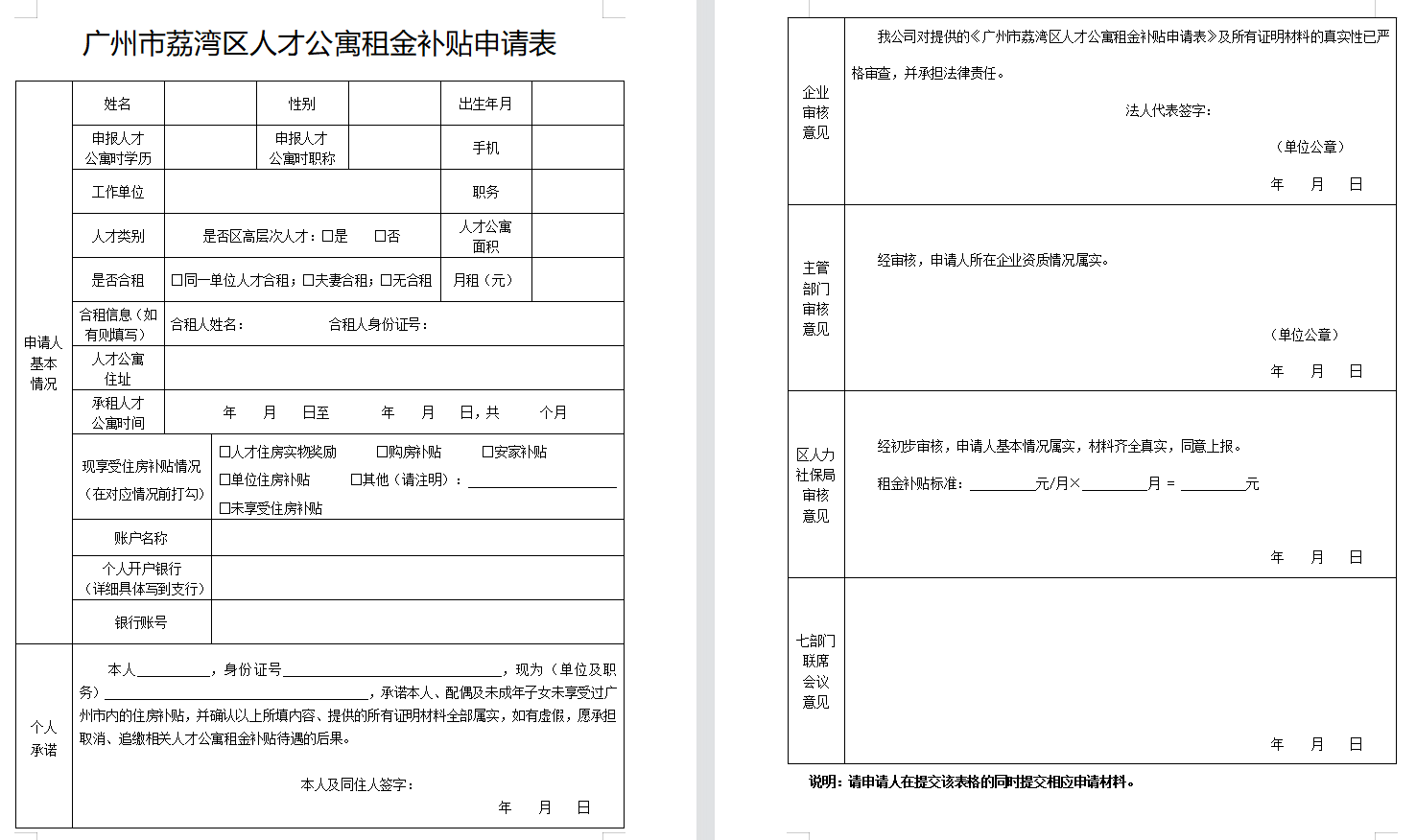 1.《广州市荔湾区人才公寓租金补贴申请表》;