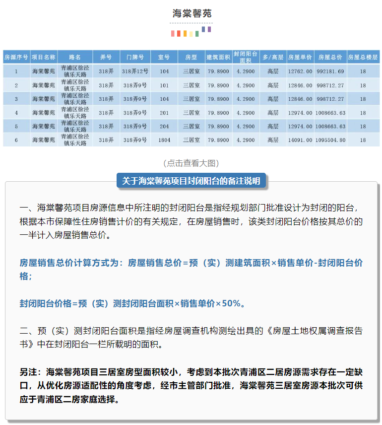 另注:海棠馨苑项目三居室房型面积较小,考虑到本批次青浦区二居房源需求存在一定缺口,从优化房源适配性的角度考虑,经市主管部门批准,海棠馨苑三居室房源本批次可供应于青浦区二房家庭选择。