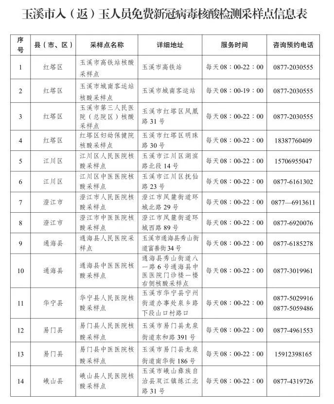 玉溪免费核酸检测时间表及咨询电话