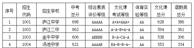(四)安师大附属庐江三中录取情况。根据安师大附属庐江三中篮球体育传统项目学校、校园足球定点学校招生计划数,依据考生志愿,对中考总分达到我县普通高中录取最低控制线的考生,按照专业测试成绩从高分到低分录取。其中篮球计划招生10人,实际录取10人,足球计划招生10人,实际录取7人。对未完成的计划,调整为该校统招生计划。