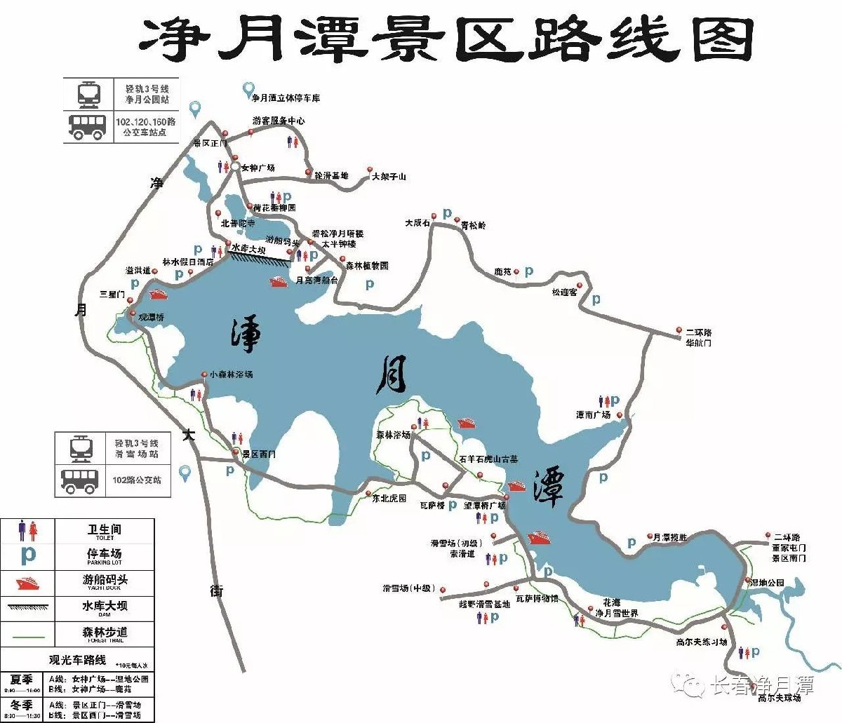 1、乘坐轻轨3号线在净月公园(正门)下车,或者滑雪场站(净月潭西门)站下车;