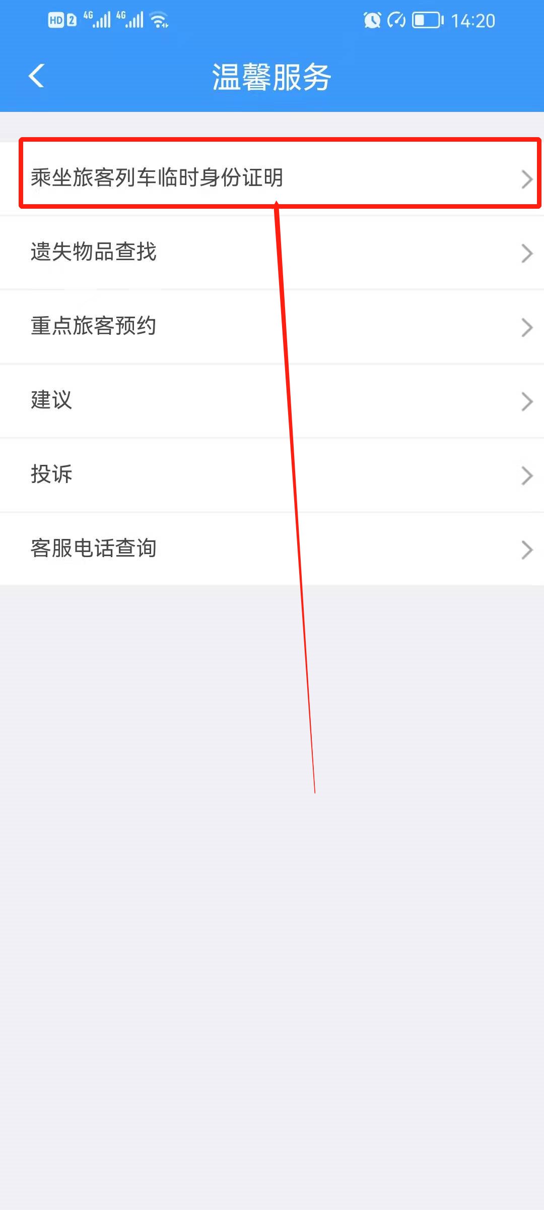 第二步:接着在跳转的页面中点击“乘坐旅客列车临时身份证明”;