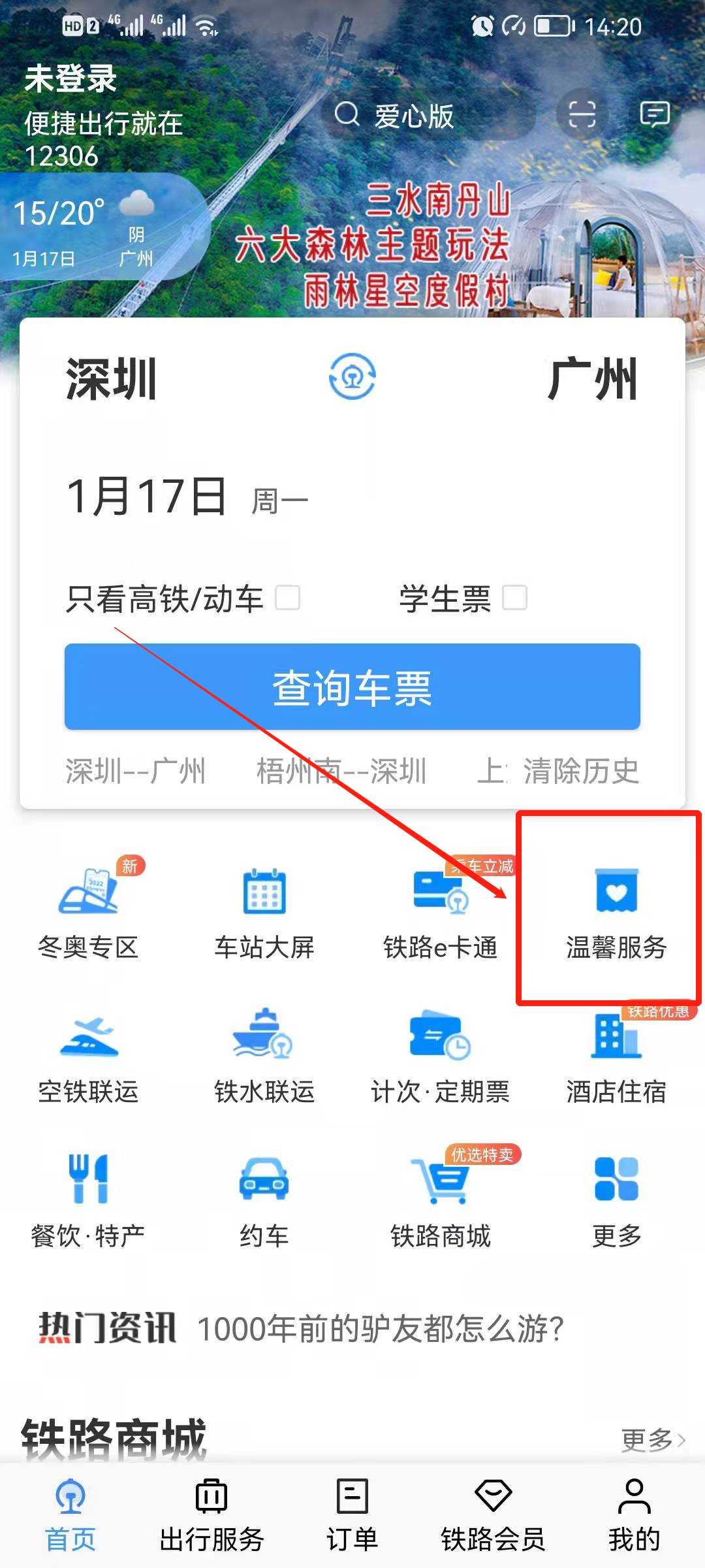 第一步:下载“铁路12306”APP,然后打开APP,进入首页点击“温馨服务”;